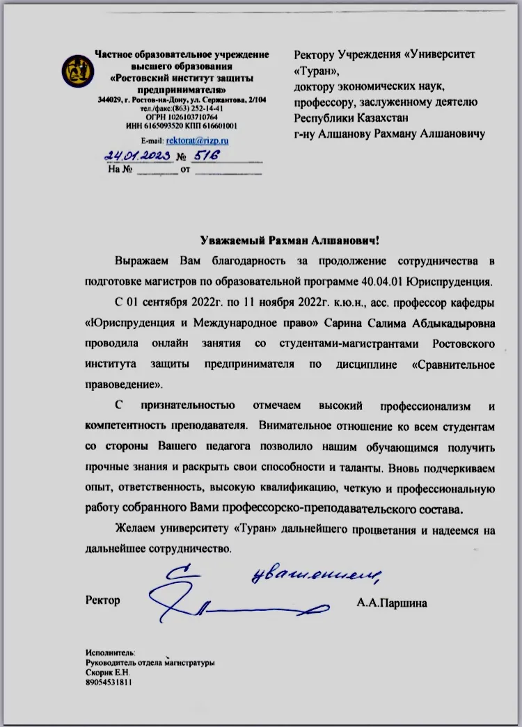 The private educational institution of higher education “Rostov Institute for the Protection of an Entrepreneur” expresses gratitude for the continued cooperation in the preparation of undergraduates in the educational program “Jurisprudence”.