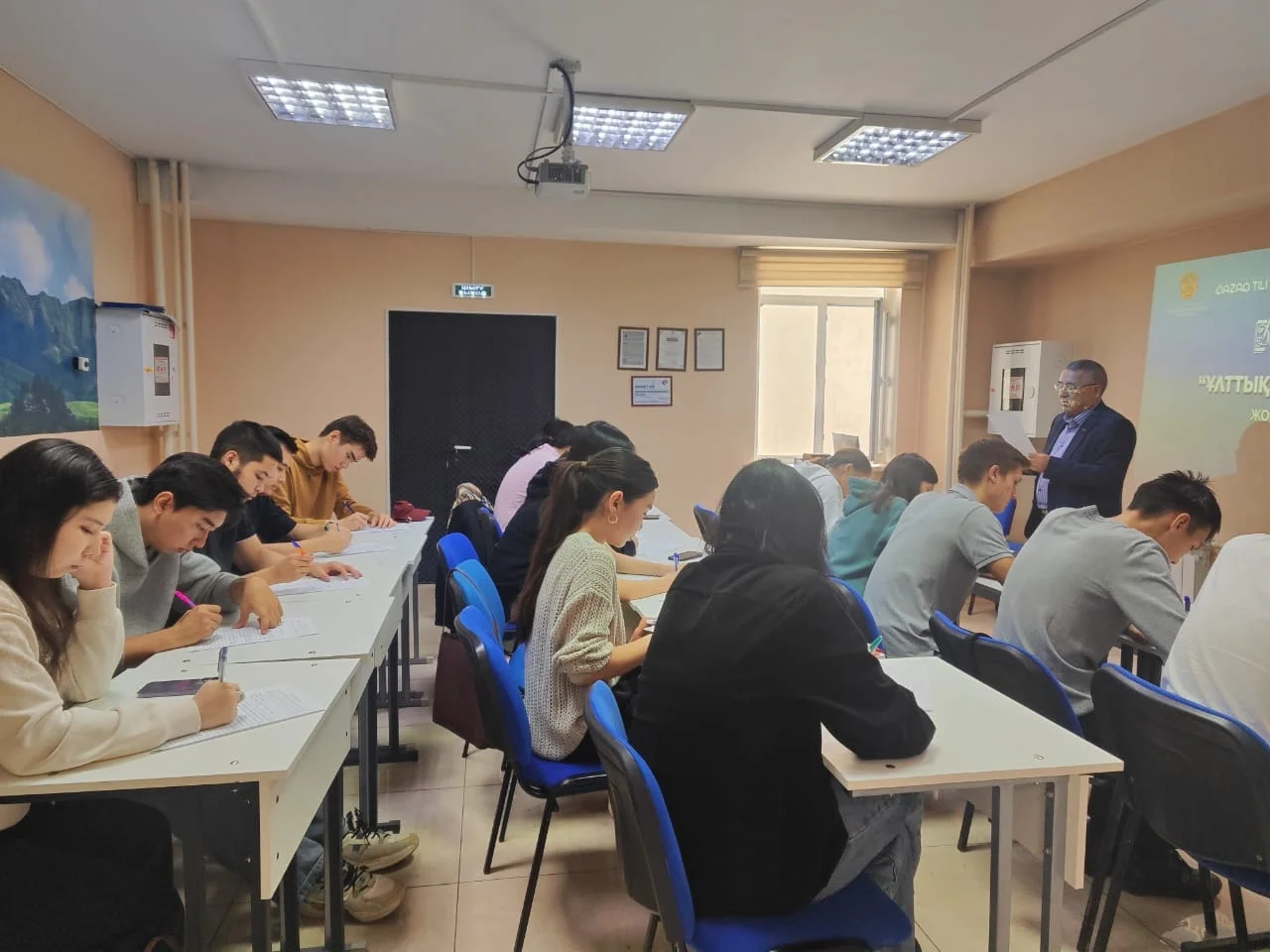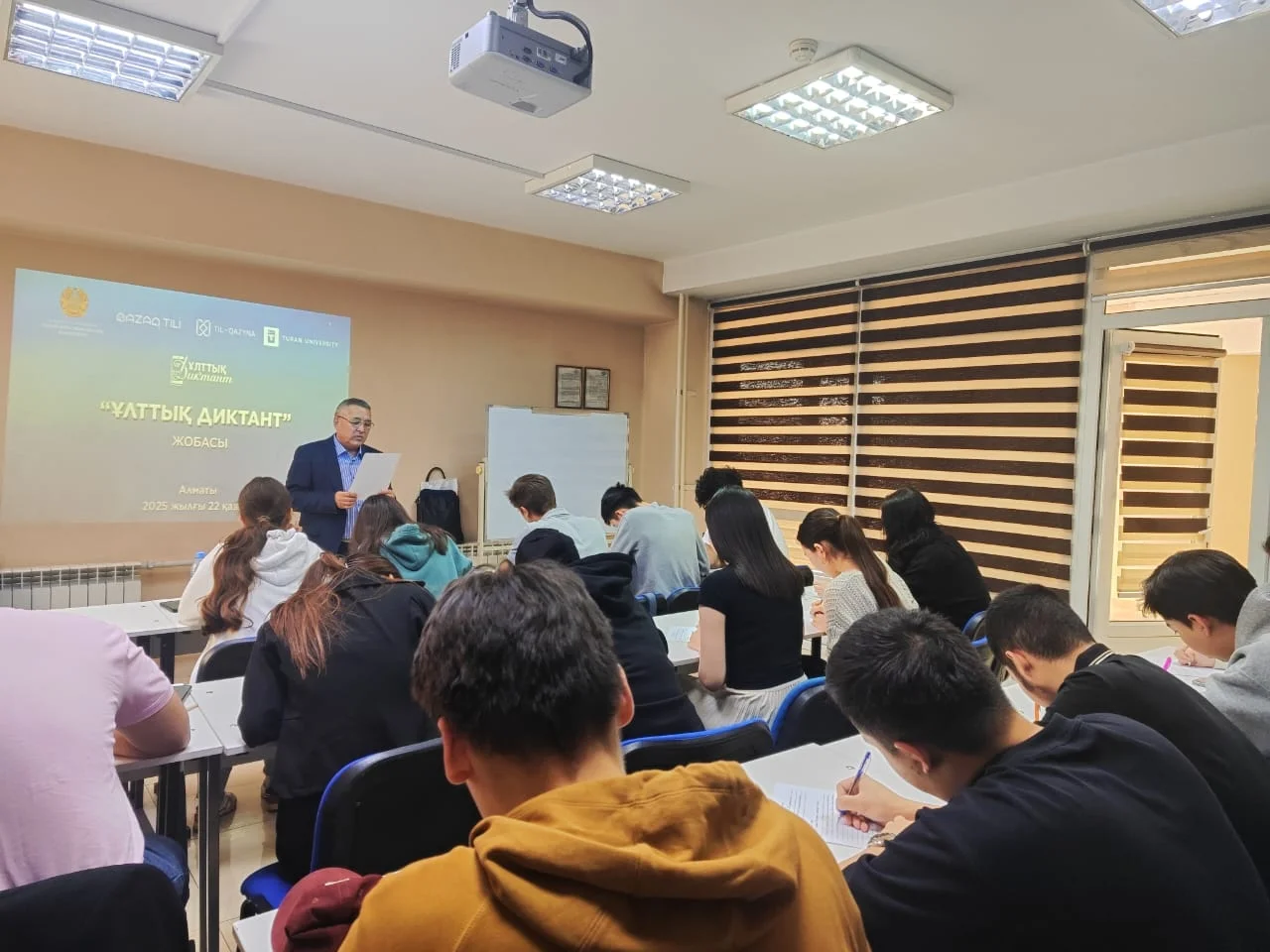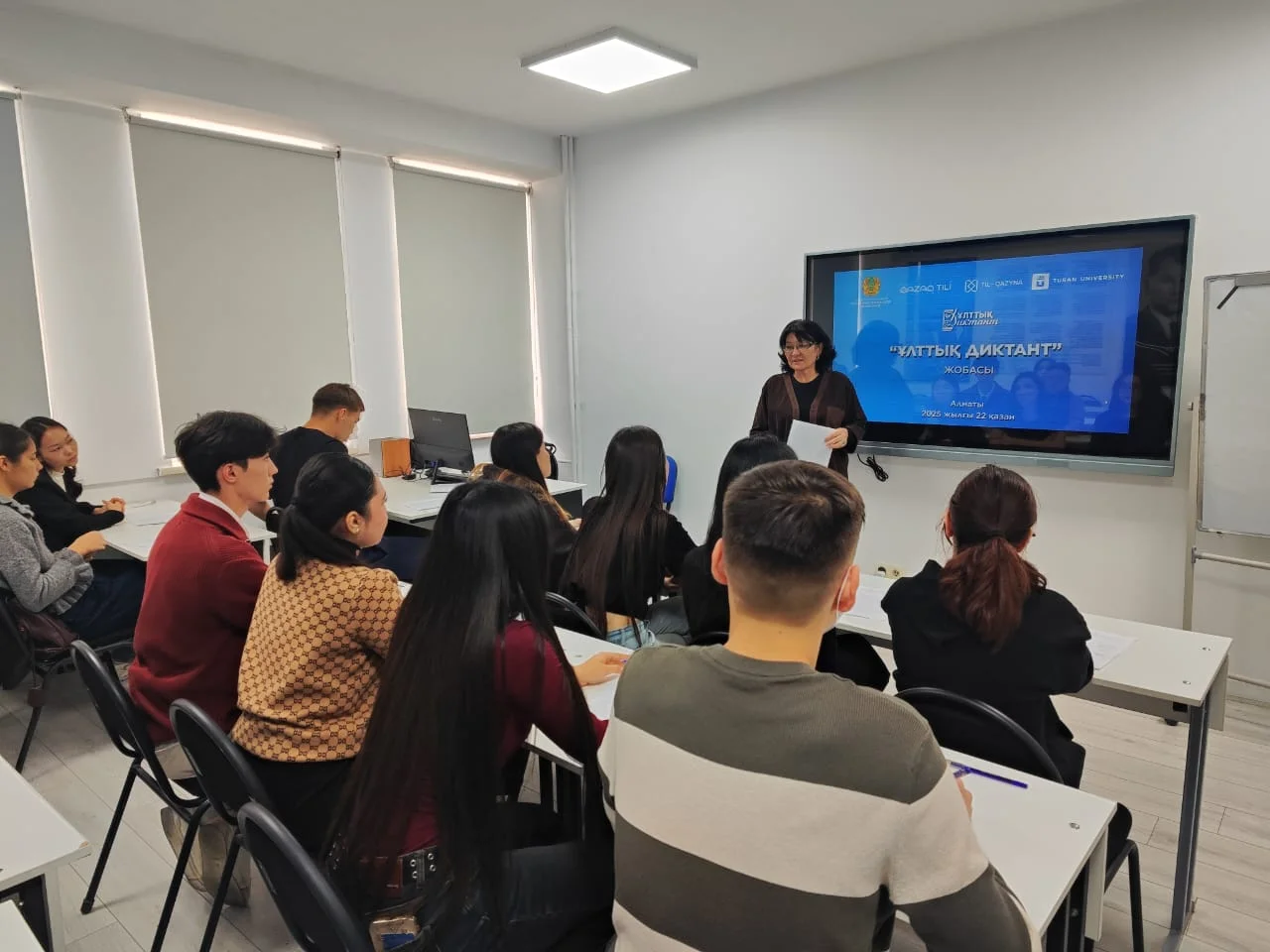 At the initiative of the International »Qazaq Tili» Society and the National Scientific and Practical Center «Til-Qazyna» from October 22 to 23, 2025, more than 630 first- and second-year students of Turan University (Kazakh, Russian, and English departments) participated in the republican «National Dictation» project.
