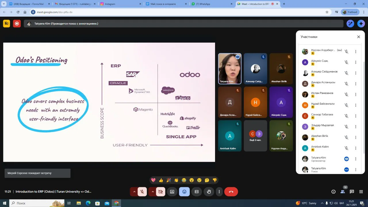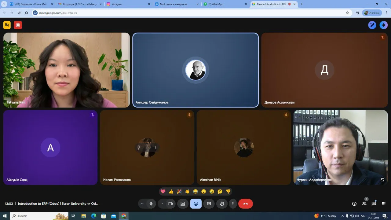 As part of the collaboration aimed at integrating modern digital technologies into the educational process, a specialized interactive workshop on the topic “Introduction to ERP (Odoo). How Modern Companies Automate Business Processes” was held at “Turan” University on November 24. The event took place online (Google Meet).