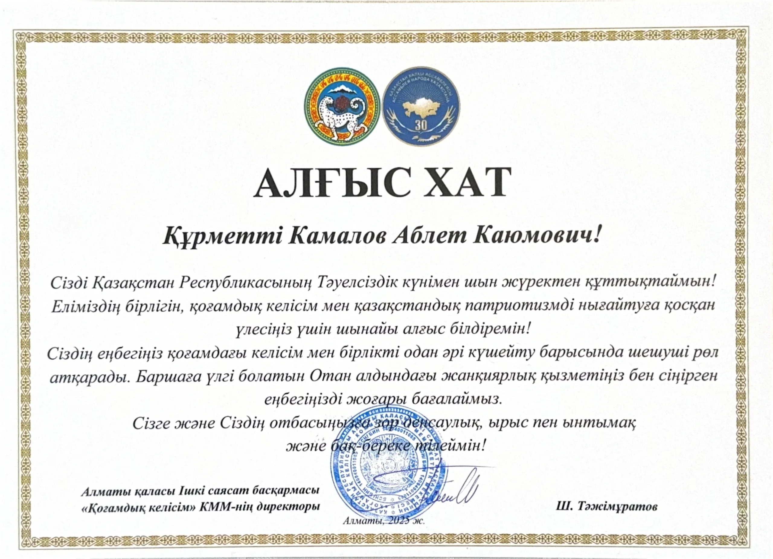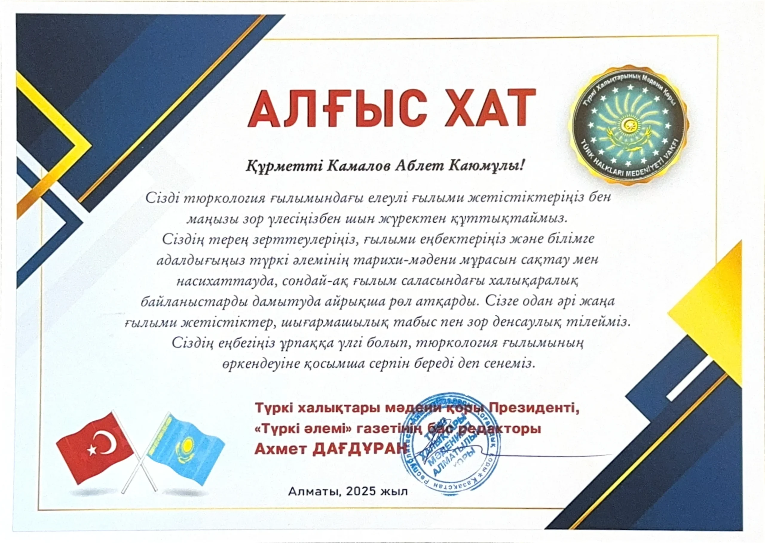 Professor Dina I. Razakova, Vice-Rector of Turan University for Strategic Development, Science, and Innovation, Karlin N. Makhpirov, Director of the ‘Turan Duniyasi’ Foundation for the Culture of the Turkic Peoples, G.V. Kan, Head of the Academic Expert Group of the Assembly of People of Kazakhstan (APK), M. Mansurov, Member of the APK, and Ahmet Dagduran, President of the Foundation for the Turkic Peoples’ Culture delivered welcome addresses. Prof. G.V. Kan handed over the Letters of Appreciation issued by the Department of Internal Affairs of the Mayor administration of the city of Almaty, to Prof. A.K. Kamalov, the Director of the Center for Regional Studies, for his contribution to the development of science and national harmony in Kazakhstan, and A. Dagduran handed the Letter of Appreciation issued by the Foundation for the Turkic Peoples’ Culture to A. Kamalov for his contribution to the development of Turkic Studies.