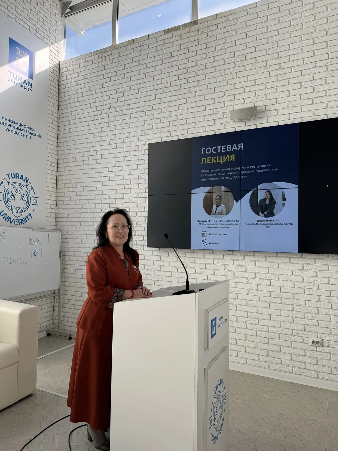 Модератор: Құқық жоғары мектебінің директоры, PhD доктор К.А. Джұмабаева дәріс барысында Қазақстандағы конституциялық өзгерістердің негізгі бағыттары, олардың құқықтық мемлекетті нығайтудағы және демократиялық институттарды дамытудағы маңызы қаралды. Студенттер сарапшыға сұрақтар қойып, заң саласындағы реформалардың практикалық қолданылуын талқылауға мүмкіндік алды.