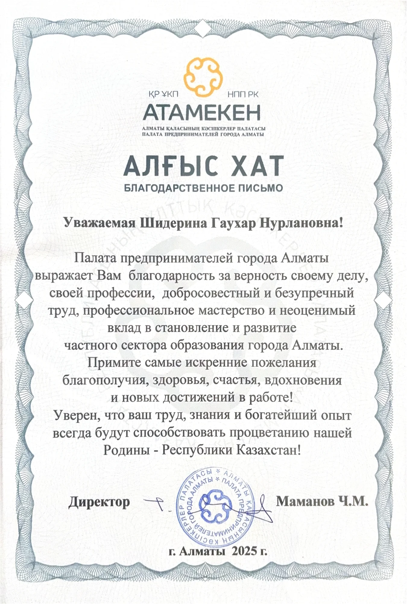 Алматы қаласы кәсіпкерлер палатасы «Атамекен» Шидерина Гаухар Нұрланқызын өз ісіне адалдығы, жоғары кәсібилігі, адал және мінсіз еңбегі, сондай-ақ қаланың жеке білім беру секторының дамуына қосқан зор үлесі үшін алғыс хатпен марапаттады.