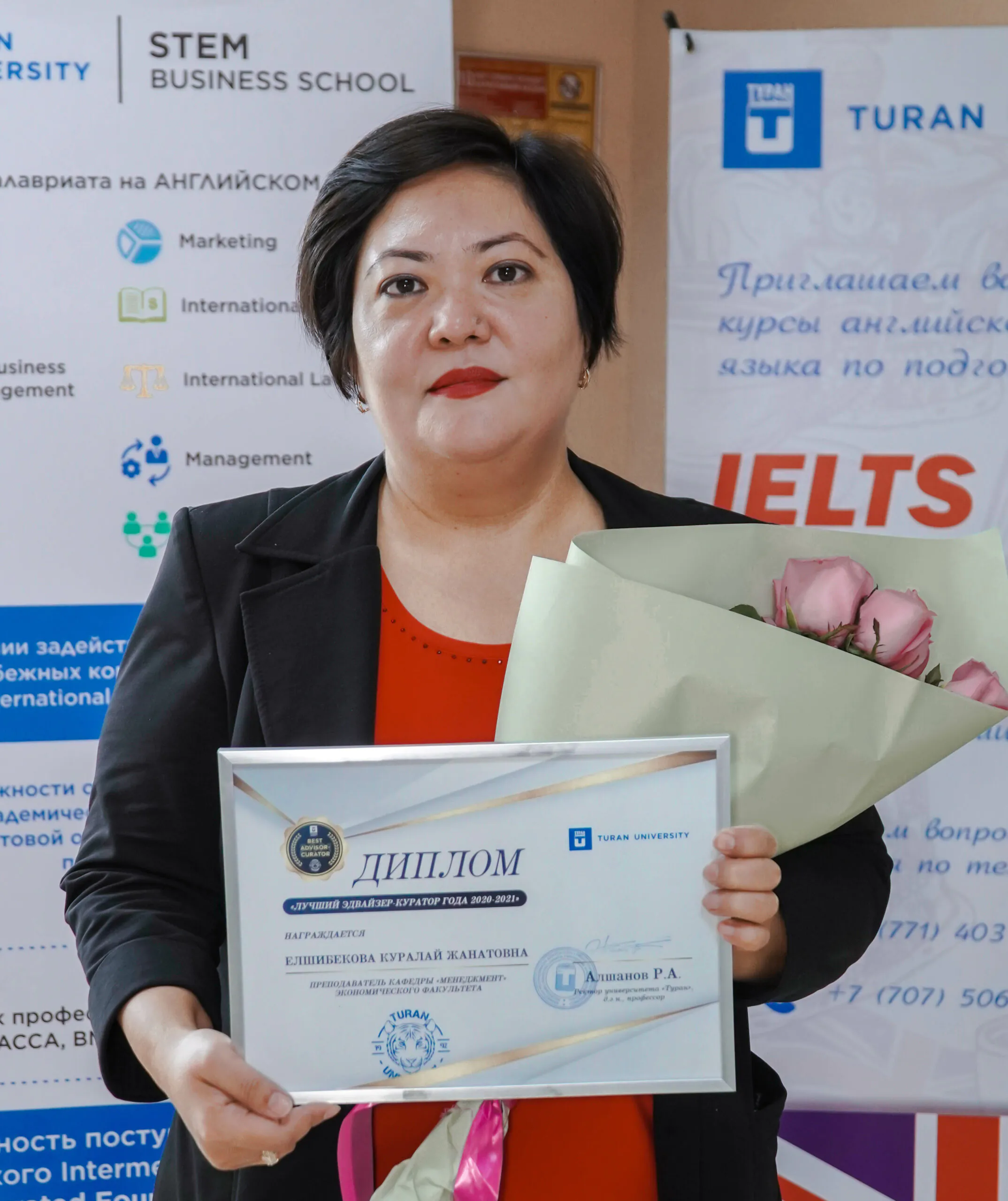- Елшибекова Куралай Жанатовна, преподаватель кафедры «Менеджмент», эдвайзер групп «Менеджмент» 191 (4), «Менеджмент» 192 (4), «Менеджмент» 202 (3), «Менеджмент» 212 (2), «ГиМУ» 191 (4)