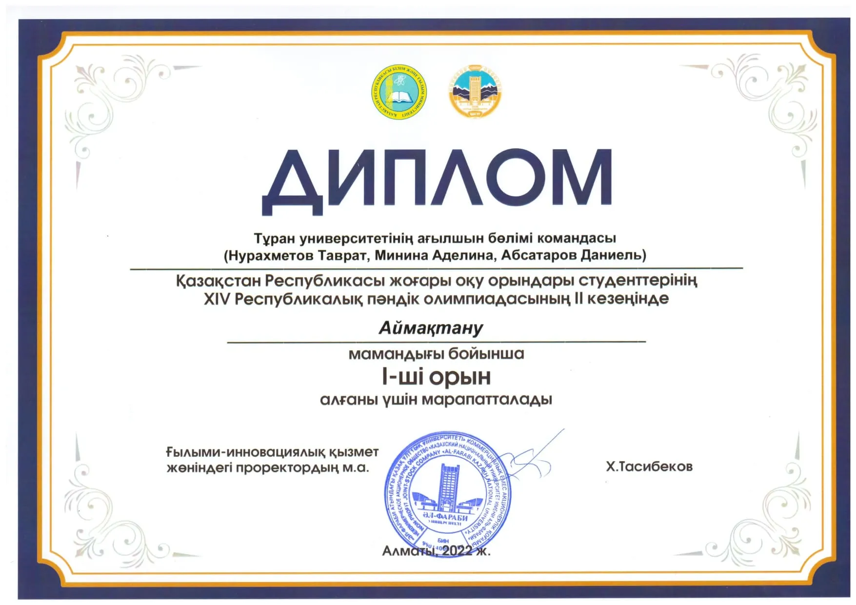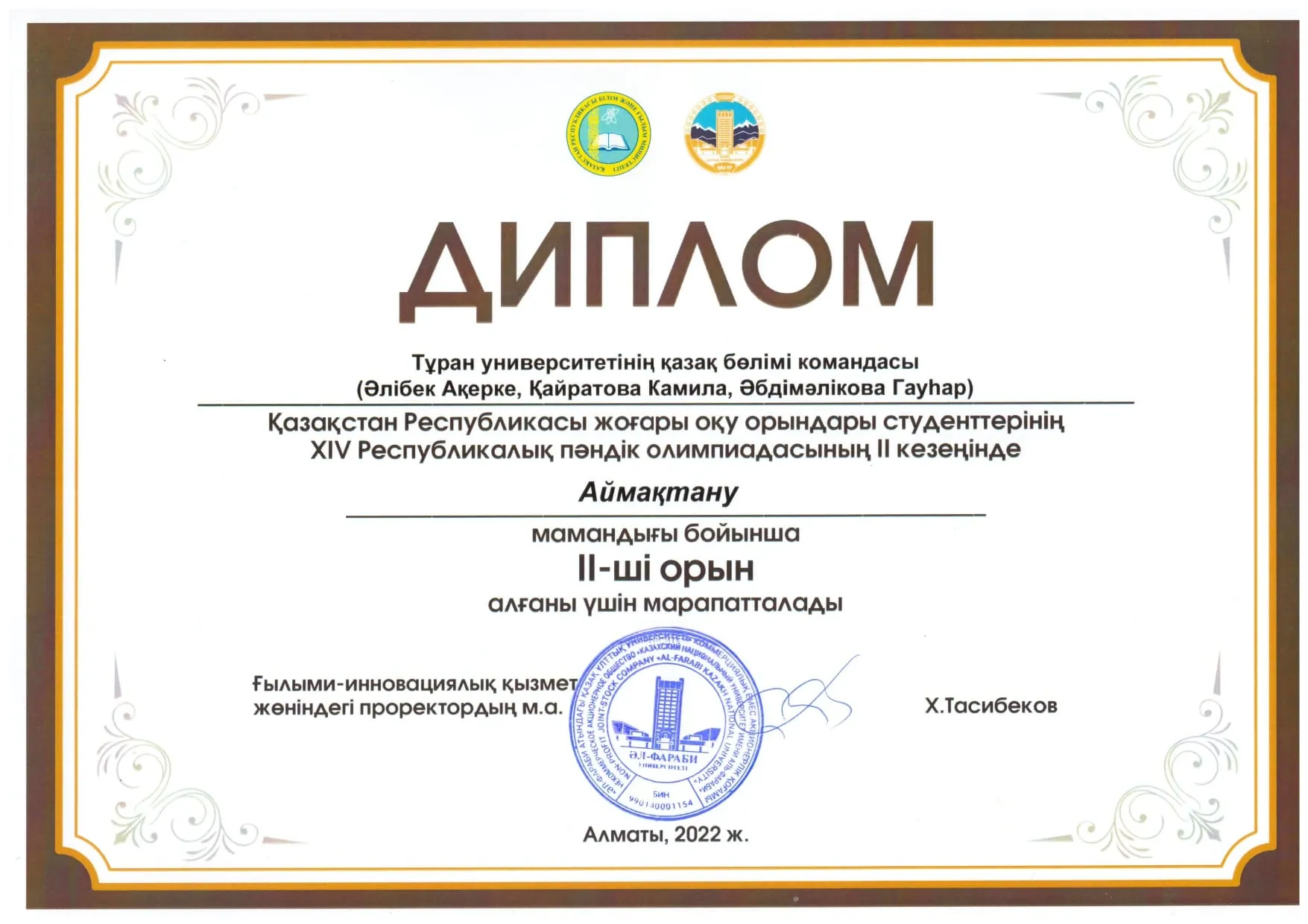 27 апреля 2022 года прошла ежегодная XIV Республиканская студенческая предметная олимпиада по специальности «Регионоведение», запланированная МОН РК и проведенная в КазНУ имени аль-Фараби. В олимпиаде участвовали студенты специальностей «Регионоведение» и «Международные отношения» крупнейших университетов Казахстана, которые соревновались в группах на казахском, русском, английском языках. Тема олимпиады 2022 года была «Миграционные процессы в условиях трансформации системы международных отношений: основные тренды и вызовы», которая позволила обсудить и проверить знания студентов по вопросам миграции в Казахстане и во всем мире. Цель олимпиады – раскрыть творческие способности, отобрать и поддержать наиболее талантливых и одаренных студентов, а также содействовать формированию интеллектуального потенциала студентов. В рамках олимпиады студенты должны были пройти 3 этапа соревнований, которые включали в себя: подготовку видео презентации темы, команды; презентации темы выступления, обсуждение путей и рекомендаций решения проблем миграции в различных сферах; онлайн тестирование знаний в рамках предметов специальностей «Регионоведение», «Международные отношения». В олимпиаде, кроме Университета Туран, также участвовали команды из КазНУ имени аль-Фараби, Алматы менеджмент университета (AlmaU), КазУМОиМЯ имени Абылай хана, КазАТиСО, ЗКГУ имени М. Утемисова. По итогам олимпиады студенты Университета «Туран» заняли почетное 1 и 2 места.