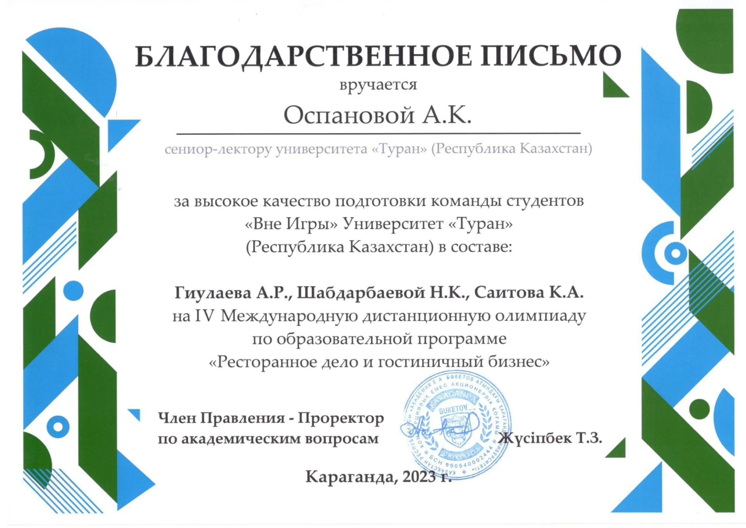 Команда студентов кафедры «Туризм и сервис» в составе Гиулаева Арслана, Саитова Карима (2 курс) и Шабдарбаевой Назерке (3 курс) была награждена дипломом III степени за победу в IV Международной дистанционной олимпиаде по образовательной программе «Ресторанное дело и гостиничный бизнес».