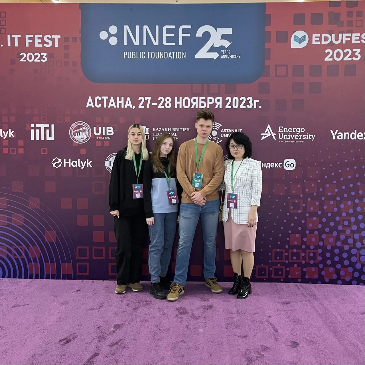 27-28 ноября 2023 года студенты 3 курса ОП «Информационные системы» Гаврилова Анастасия, Гридасова Дарья, Зинченко Максим и Еркимбеков Инкар приняли участие в фестивале ITFest-2023, который проводился в рамках 25-летнего юбилея NNEF Public Foundation в городе Астана.