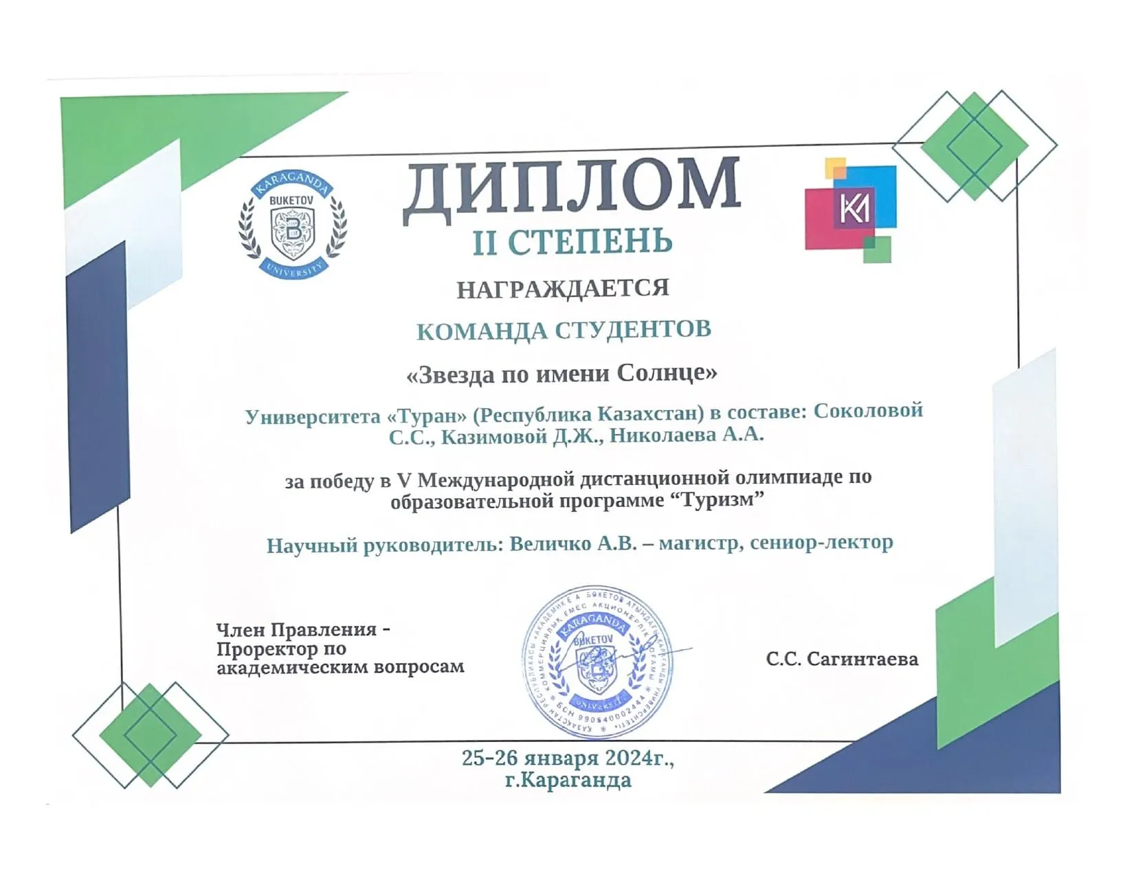 Поздравляем команду университета «Туран» «Звезда по имени Солнце» в составе: Соколовой С.С., Казимовой Д.Ж., Николаева А.А., занявшую II призовое место в V Международной дистанционной олимпиаде по образовательной программе «Туризм». Олимпиада ежегодно проводится на базе Карагандинского университета имени академика Е.А. Букетова. В этом году в конкурсе приняли участие 9 команд из Казахстана и стран СНГ. Для участия в конкурсе командам необходимо было разработать туристский маршрут для I тура, а также снять видеоролик по предложенным направлениям в рамках II тура.